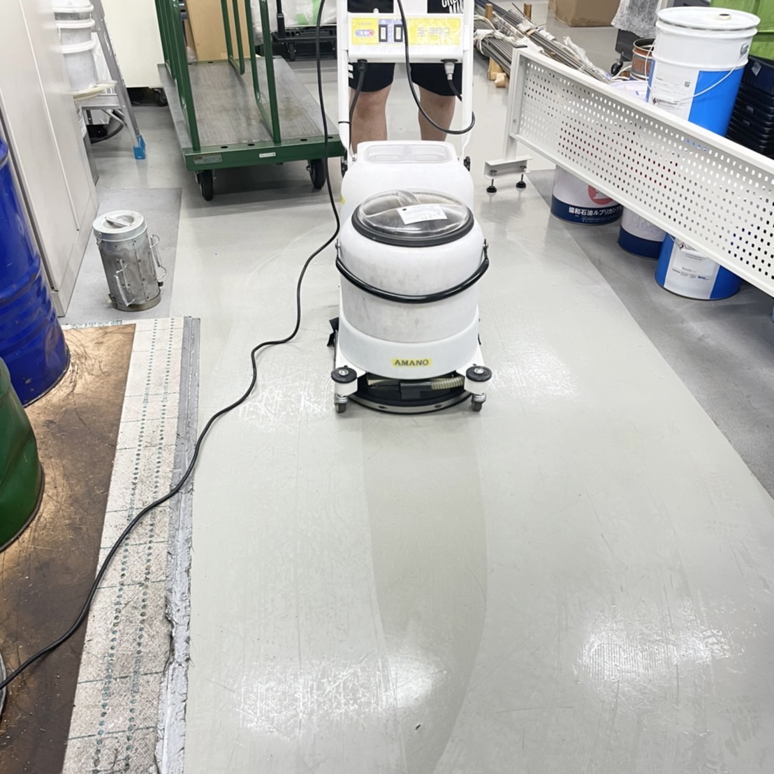 深江ファクトリーでは、週に数回、床洗浄機を使って工場の床を徹底的にキレイにしています。(製造に必要な切削油で常に床がツルツルで滑りそうになるので、床の洗浄は必須)