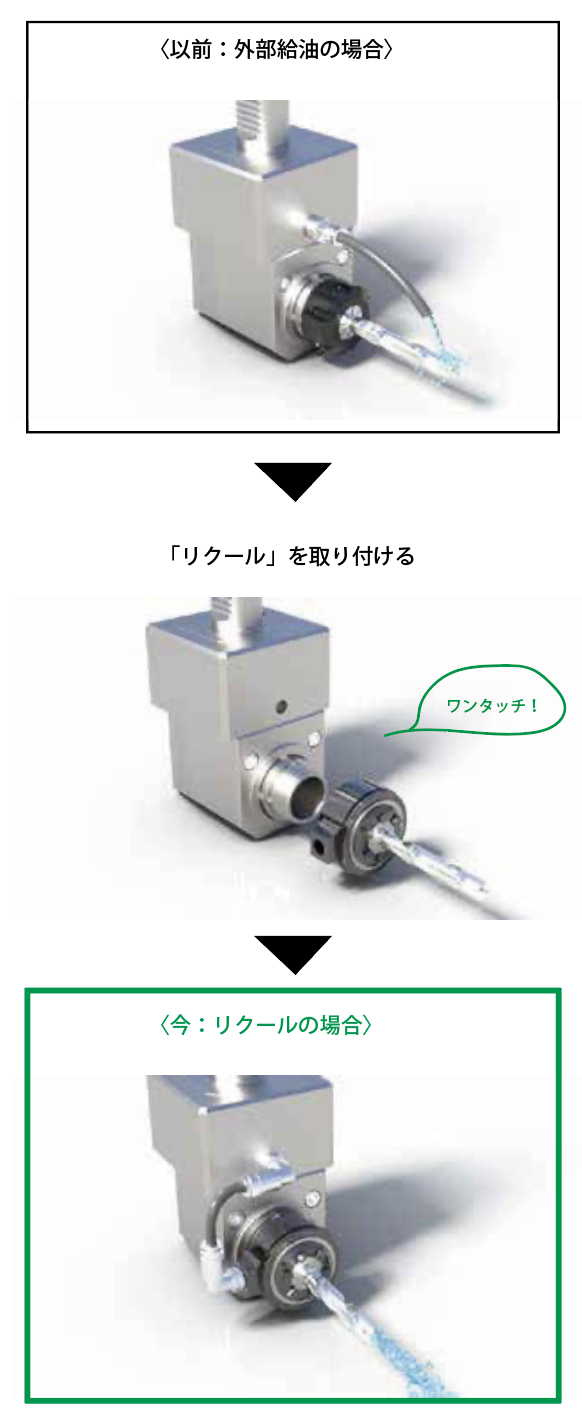 reCool(リクール)」は、穴あけ加工の際に外部給油専用の静止工具で内部給油加工ができるER型クランプナットです。このアイテムのすごいところは、なんと言っても“後付け”ができること。たった2分で、既存の静止工具を内部給油仕様に変換できるんです!高圧配管もワンタッチジョイントで接続できて非常に便利。